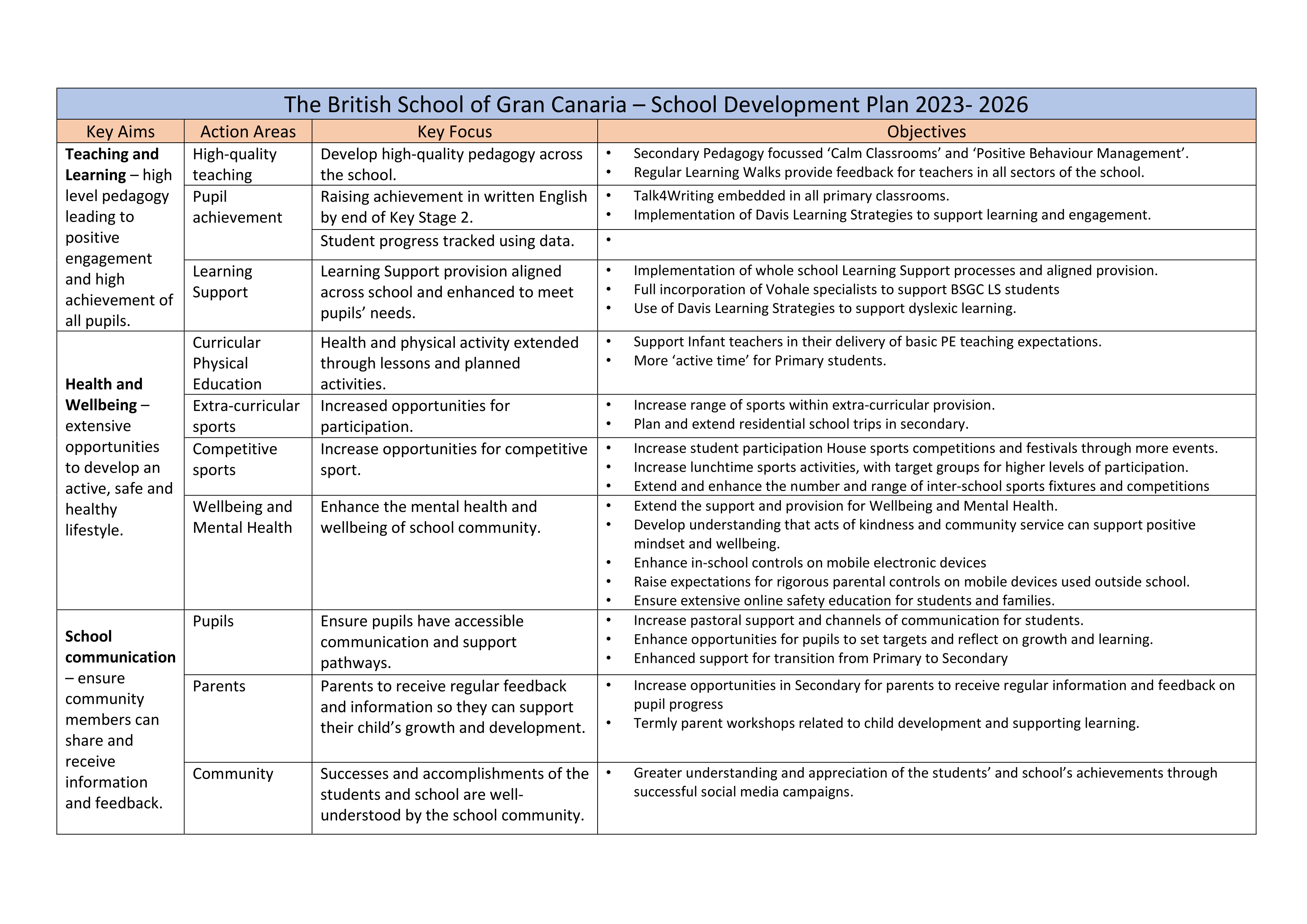 The plan was formulated from the feedback from two main sources; the school’s inspection in February 2023 (full report available via link), and the BSGC Parent Survey from March 2023. Both provided enlightening insights into the school’s strengths, as well as areas for development; these aspects formed the basis of our SDP.